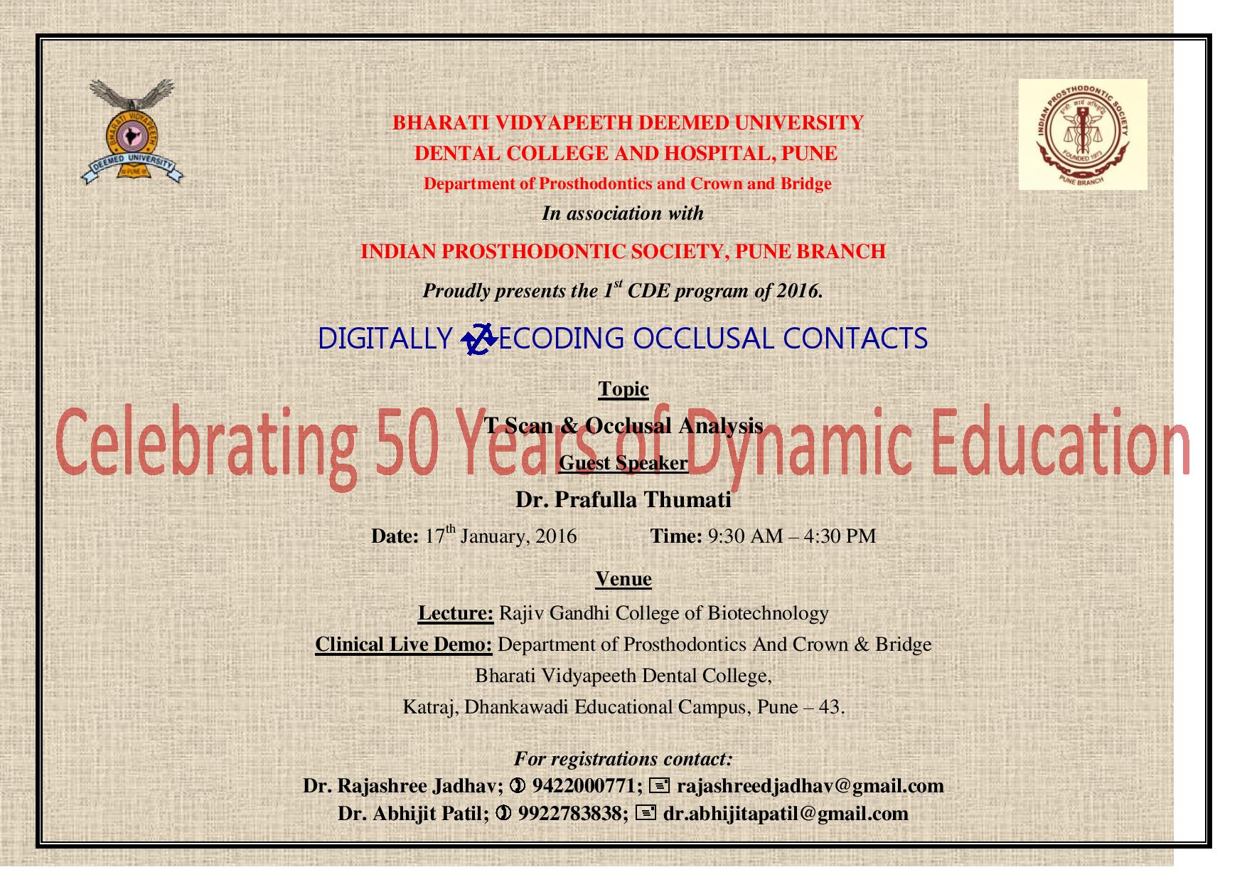 The Department of Prosthodontics and Crown and Bridge, BVDU, Dental College and Hospital, Pune , in association with the Indian Prosthodontic Society, Pune branch, is organizing the CDE program.
